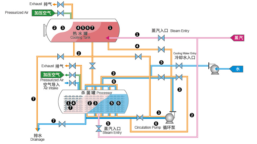 ? 殺菌結(jié)束后的熱水回收至上罐,節(jié)約蒸汽、能耗和殺菌時(shí)間。
